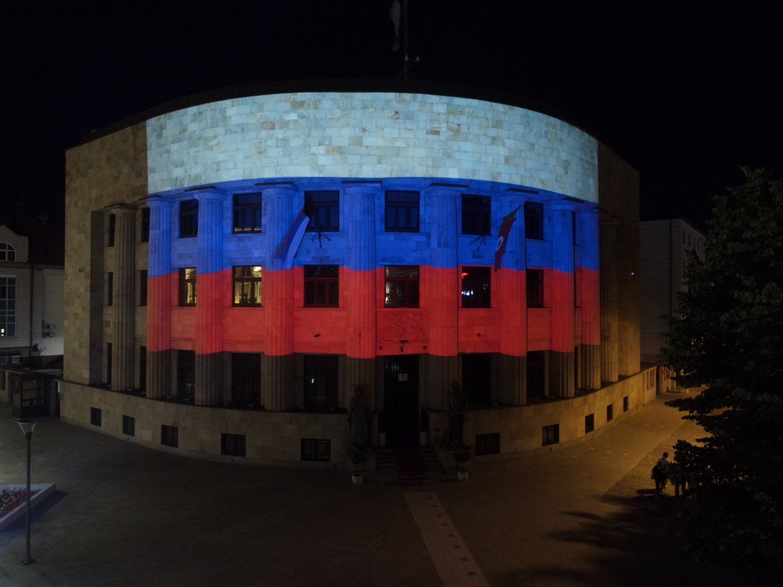 On the occasion of the National Holiday of Russia – Russia Day, the Palace of the Republic was illuminated tonight with the colours of the Russian flag.
