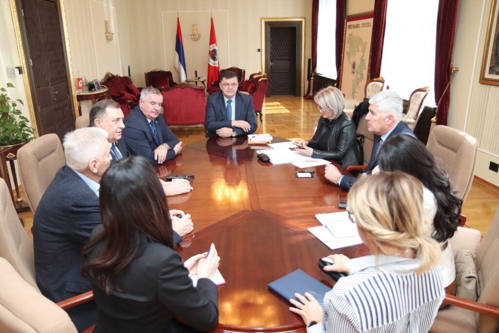 The President of the Republic of Srpska Milorad Dodik met today in Banja Luka with the Chairperson of the Council of Ministers of Bosnia and Herzegovina Borjana Krišto and the Deputy Chairperson of the House of Peoples of the Parliamentary Assembly of Bosnia and Herzegovina Dragan Čović.