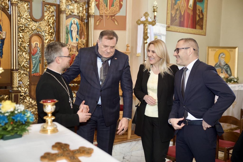 The President of the Republic of Srpska Željka Cvijanović and the Serb member of the BiH Presidency Milorad Dodik visited the Ukrainian Church of the Transfiguration of the Lord today and met with representatives of the Ukrainian community in Prnjavor.