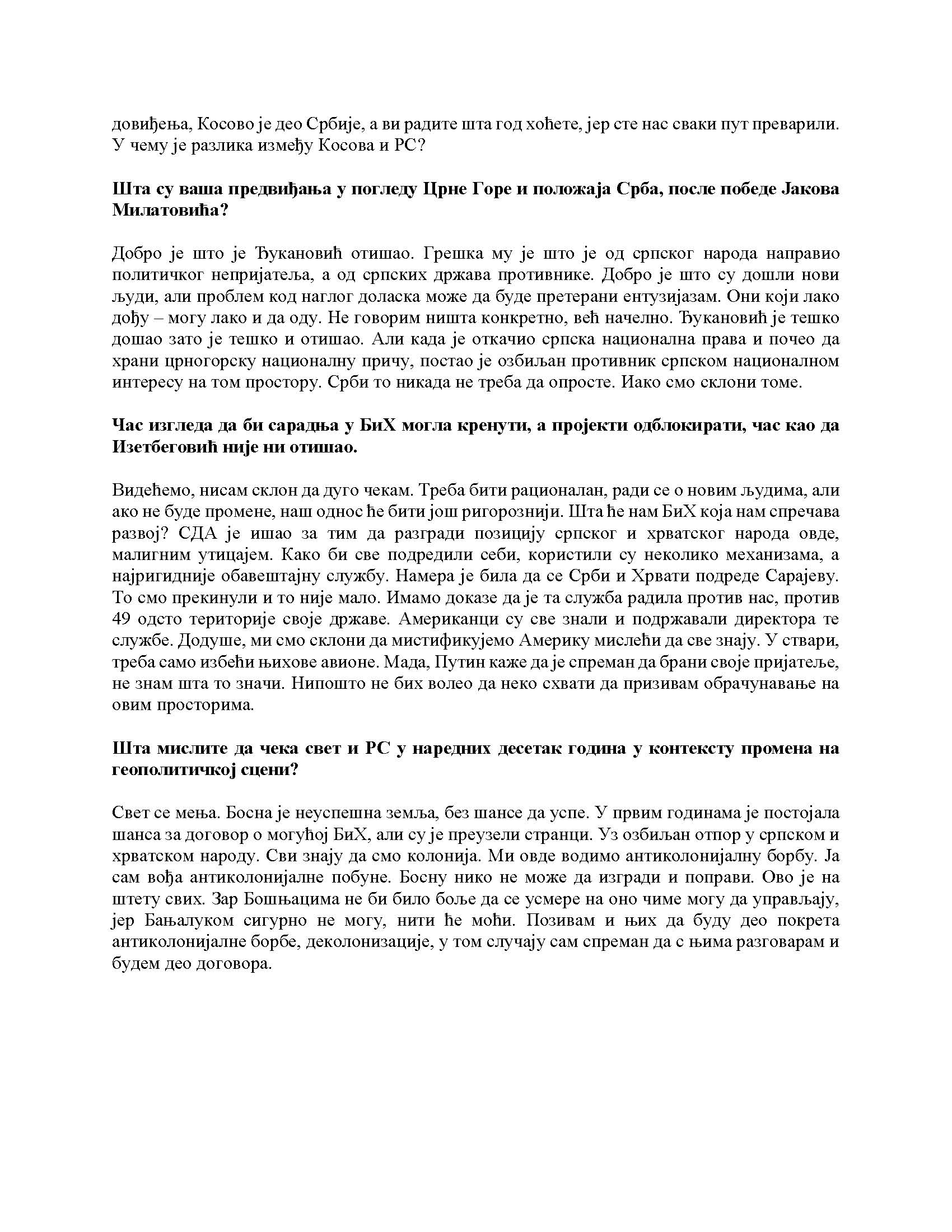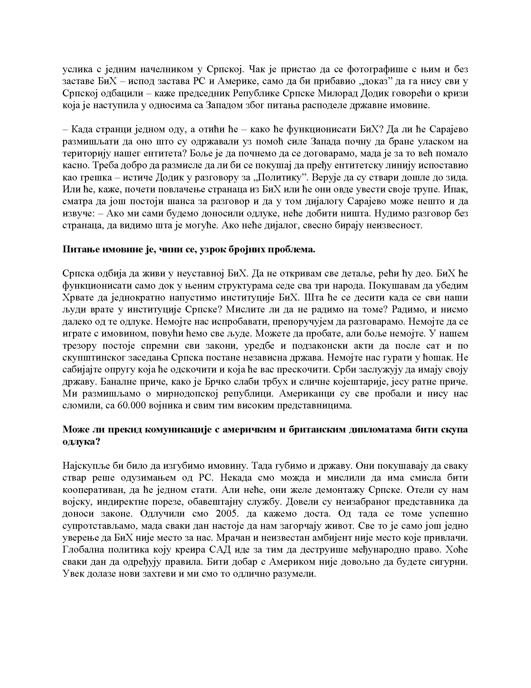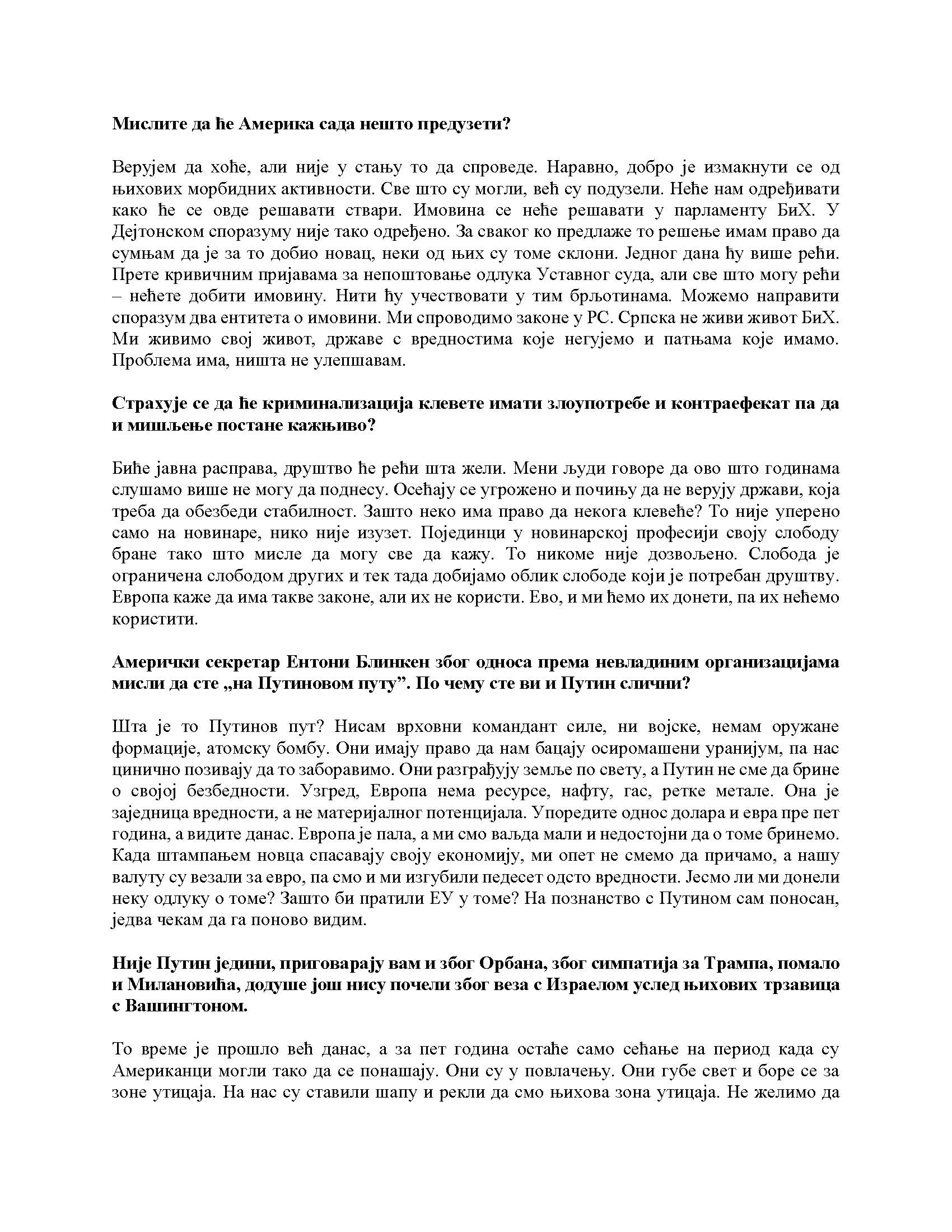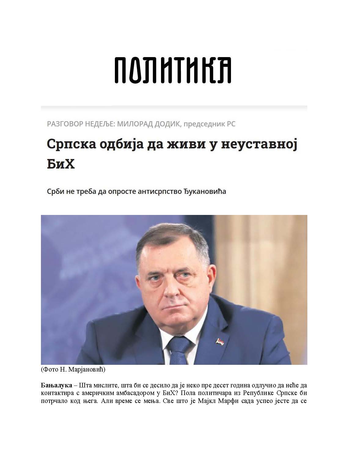 Intervju predsjednika Republike Srpske za „Politiku“, 09.04.2023. godine