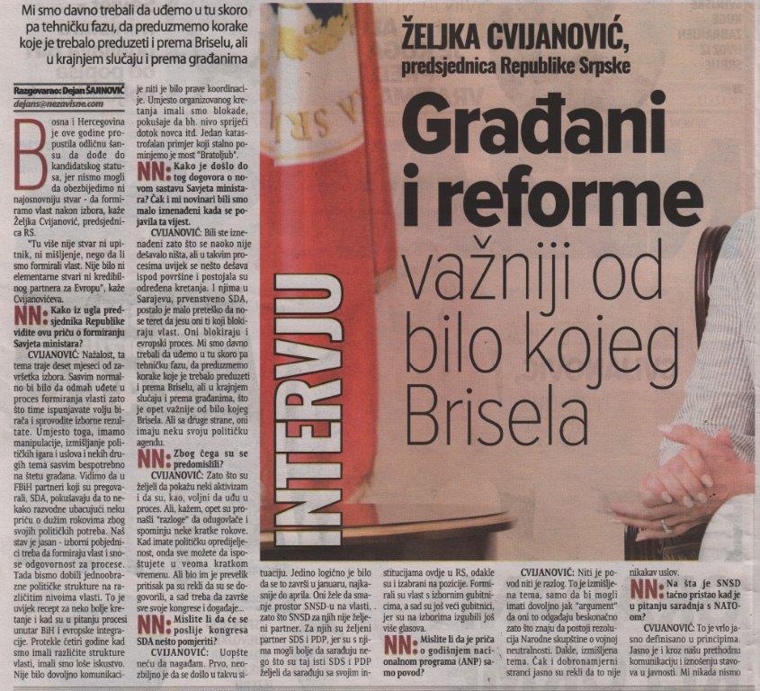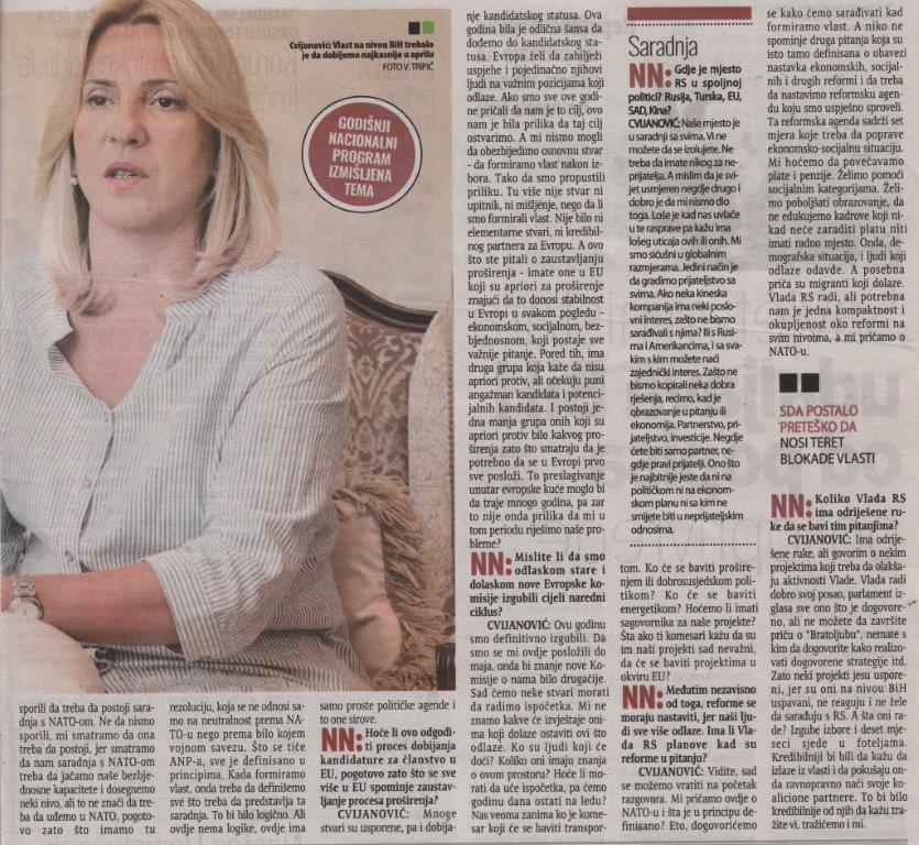 Predsjednica Republike Srpske Željka Cvijanović rekla je u intervjuu za „Nezavisne novine“ da je BiH ove godine propustila odličnu šansu da dođe do kandidatskog statusa za članstvo u Evropskoj uniji, jer nije mogla da obezbijedi ni najosnovniju stvar – formiranje vlasti nakon izbora.