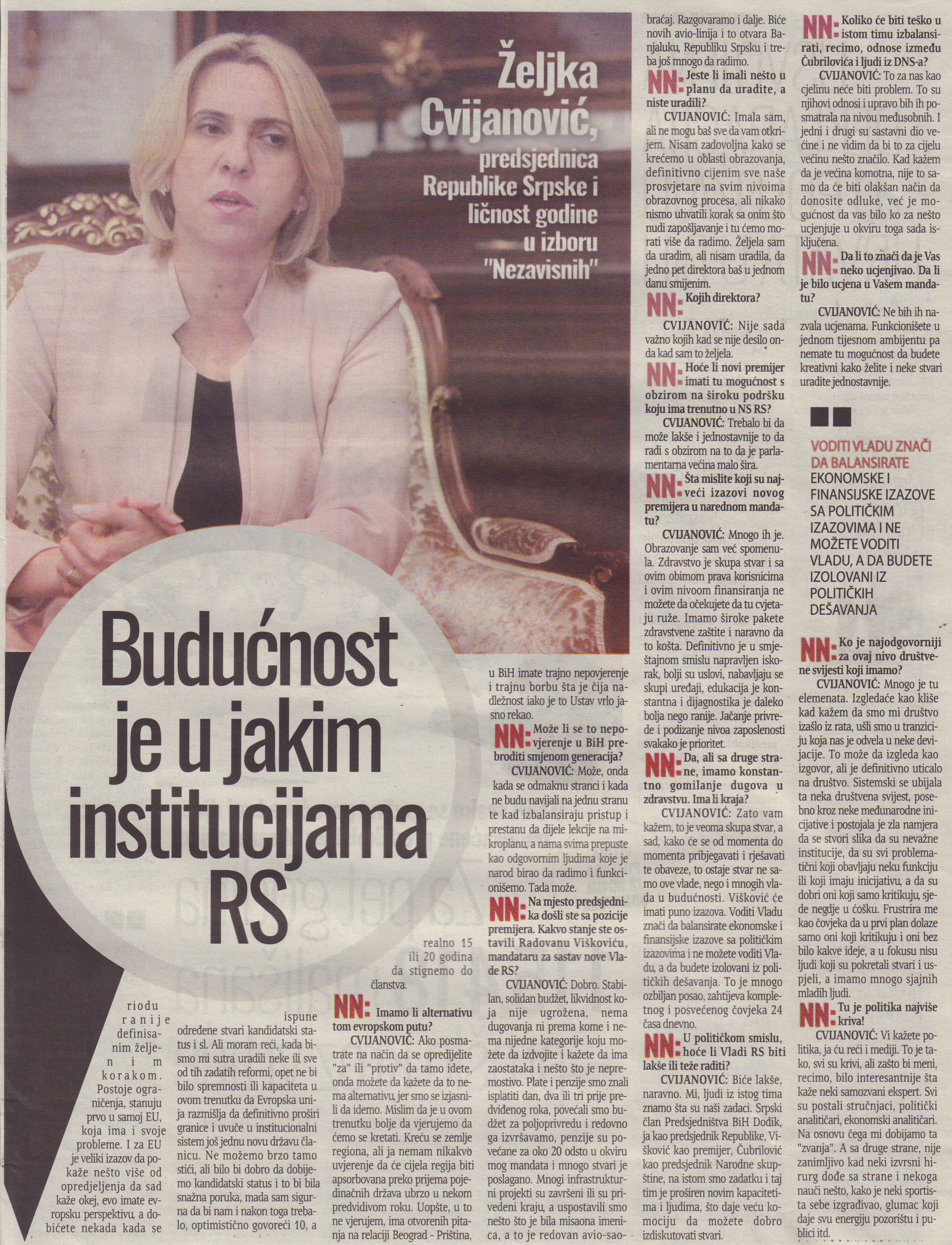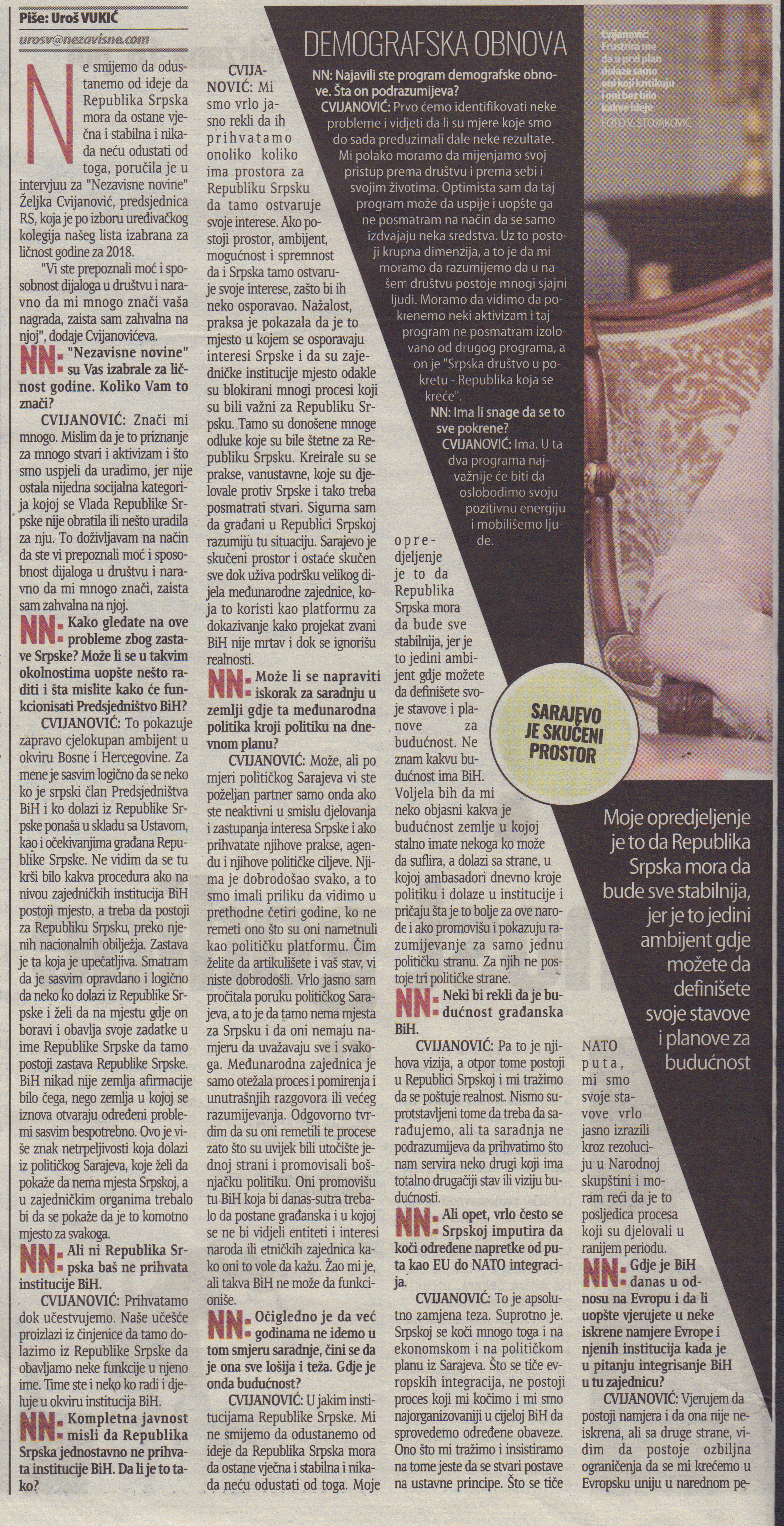 Intervju predsjednice Republike Srpske za „Nezavisne novine“