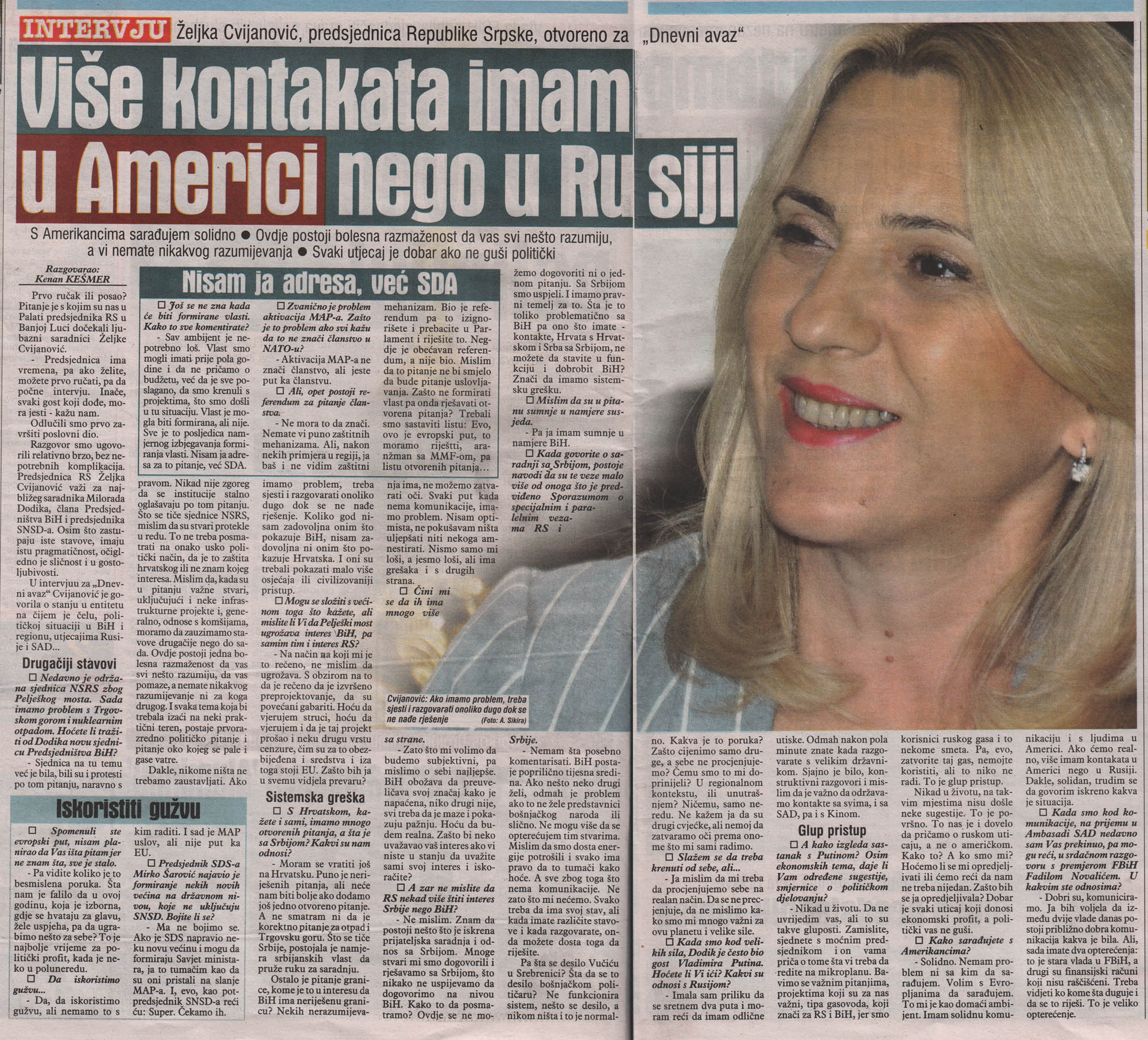 Predsjednica Republike Srpske Željka Cvijanović izjavila je u intervjuu za „Dnevni avaz“ da se u ovom mandatu Predsjedništva BiH prvi put dogodilo preglasavanje srpskog člana Milorada Dodika i da je principijelni stav institucija Srpske da svaki put kada dođe do toga treba tražiti zaštitu vitalnog interesa u Narodnoj skupštini Republike Srpske.