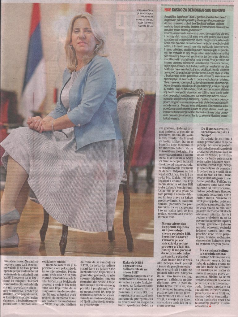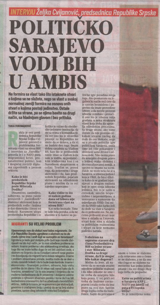 Intervju predsjednice Republike Srpske za „Euro Blic“