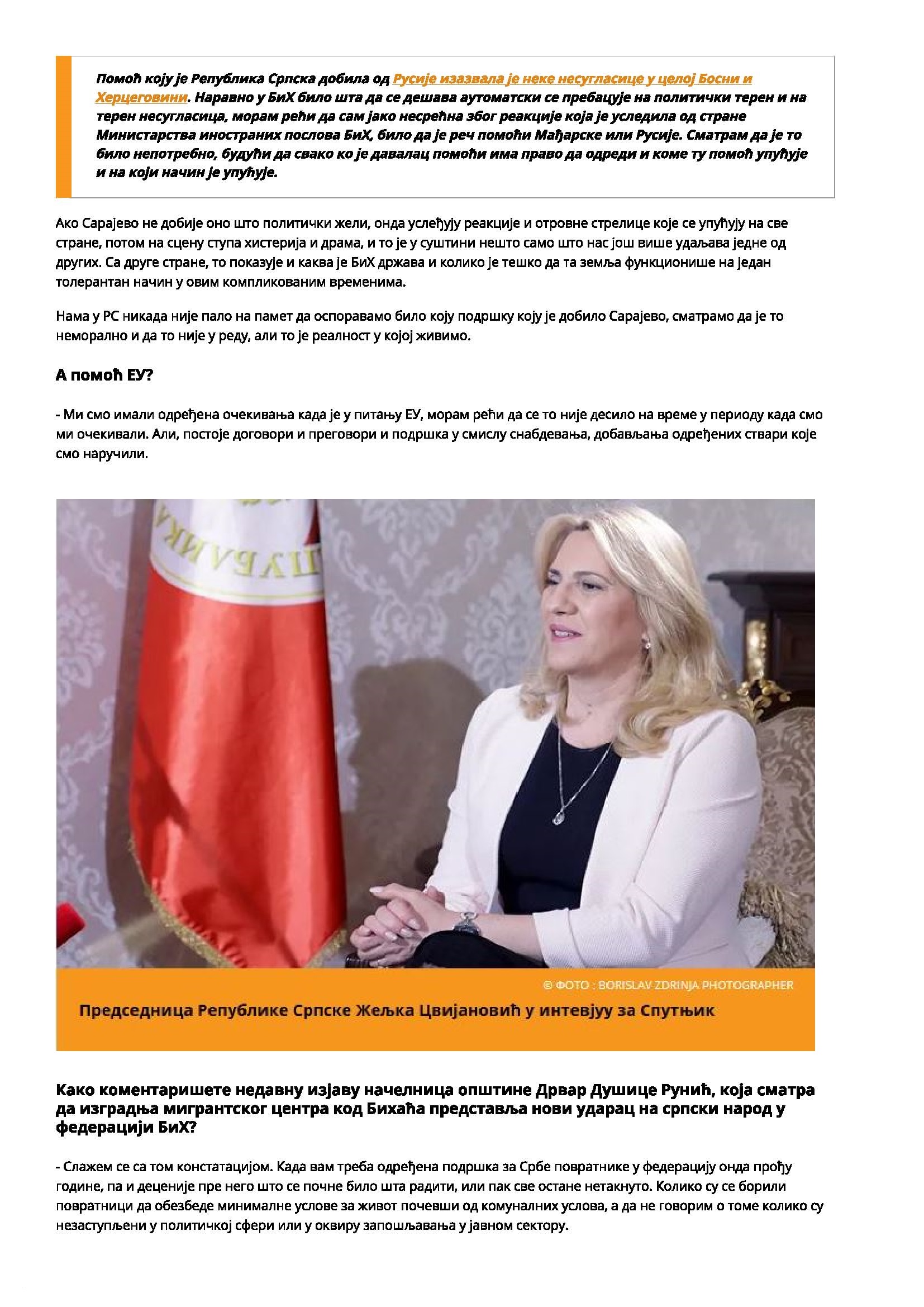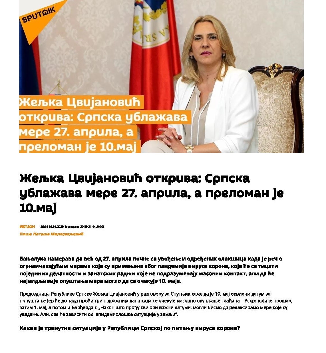 Predsednica Republike Srpske Željka Cvijanović u razgovoru za “Sputnjik” kaže da je 10. maj okvirni datum za popuštanje jer će do tada proći tri najvažnija dana kada se očekuje masovno okupljanje građana – Vaskrs koji je prošao, zatim 1. maj, a potom i Đurđevdan: „Nakon što prođu svi ovi važni datumi, mogli bismo da relaksiramo mere koje su uvedene. Ali, sve će zavisiti od epidemiološke situacije u zemlji“.