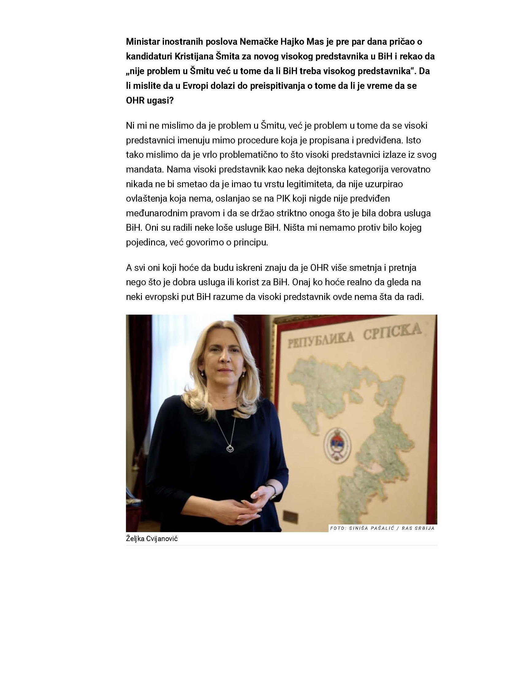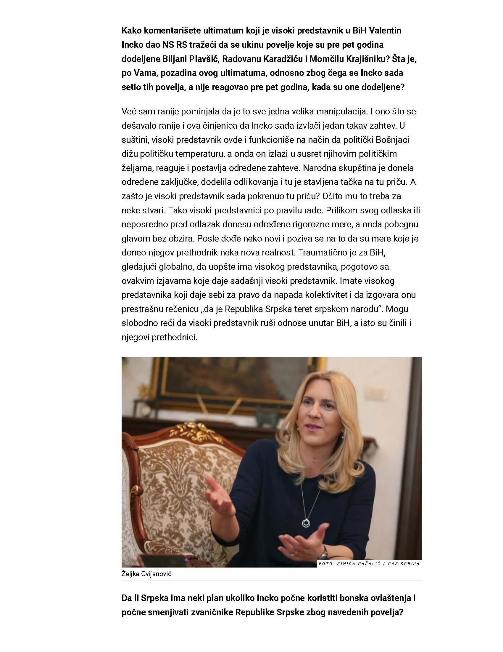 Da su visoki predstavnici bili objektivni i da se nisu stavljali na stranu samo jednog naroda, mijenjali Ustav i bili promoteri samo jedne politike, stanje u Bosni i Hercegovini bi bilo puno bolje, i ne bi bilo ovakvo kakvo je danas, rekla je predsjednica Republike Srpske Željka Cvijanović u intervjuu za „Euroblic“.