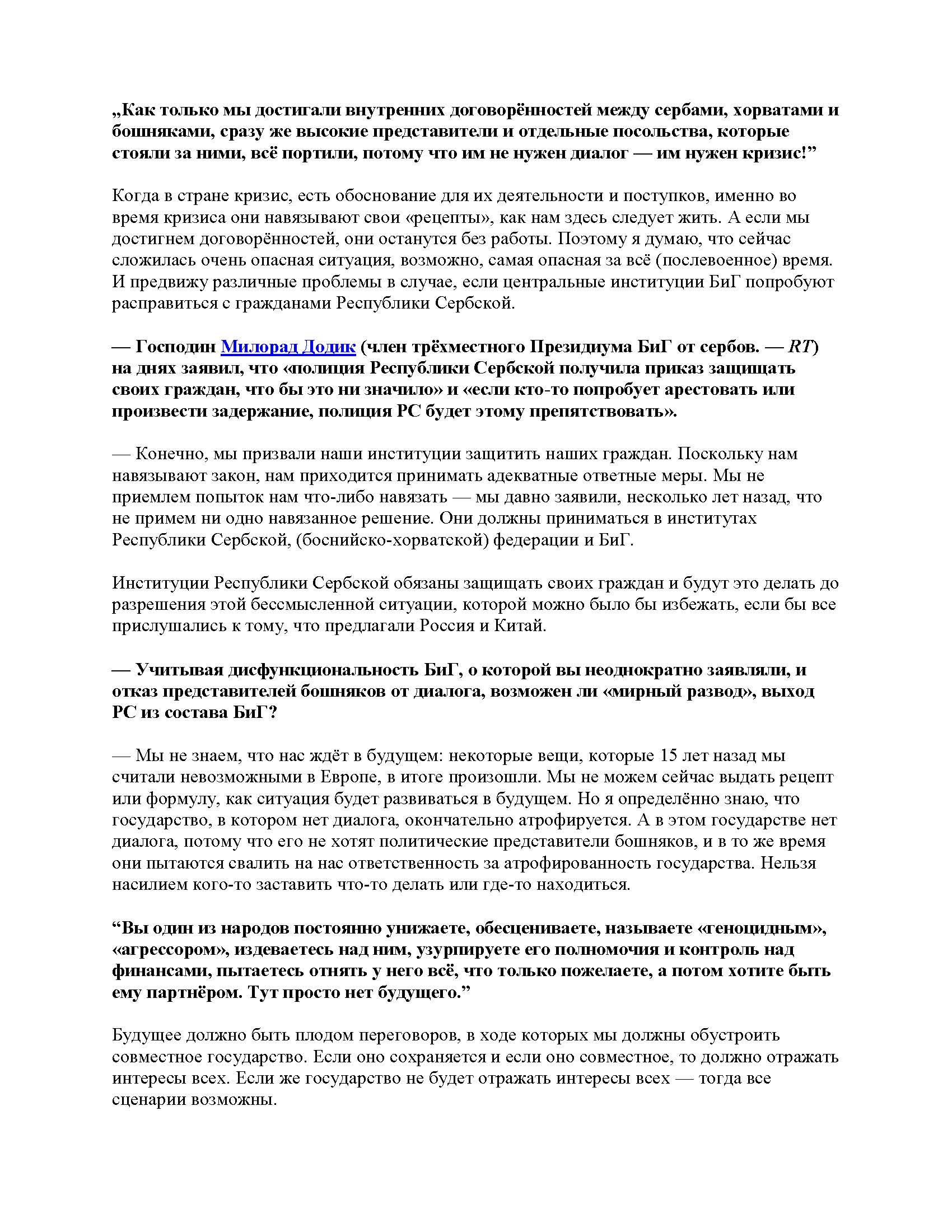 Predsjednica Republike Srpske Željka Cvijanović istakla je u intervjuu za ruski servis RT da svaka država u kojoj nema dijaloga na kraju atrofira, a BiH je jedna od zemalja bez dijaloga i budućnosti, jer politički predstavnici Bošnjaka to ne žele i za to pokušavaju da prebace odgovornost na Srbe.