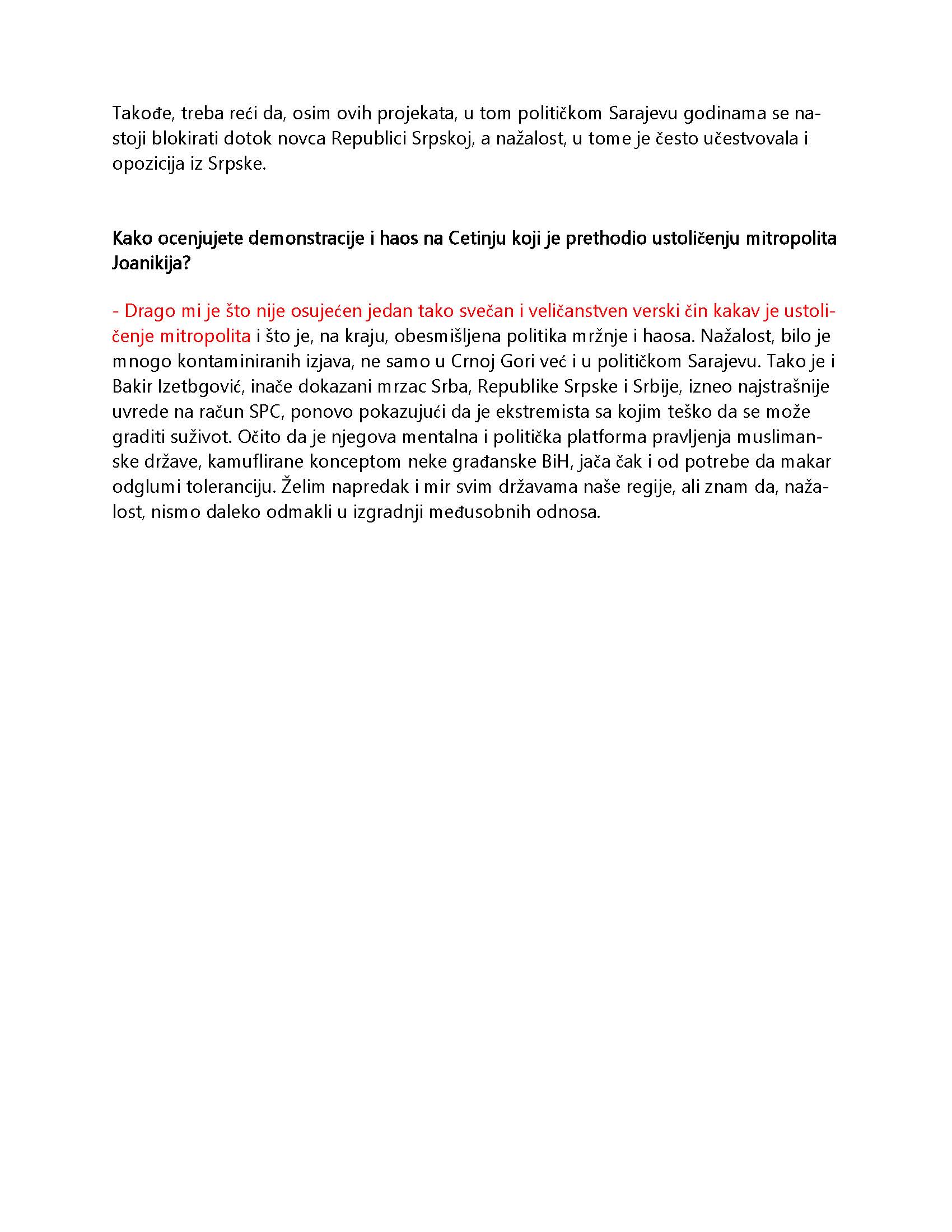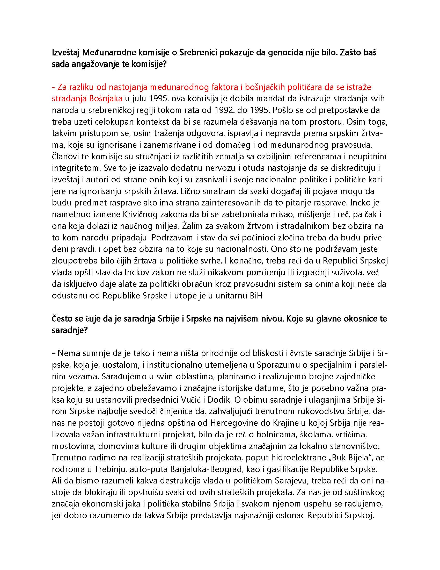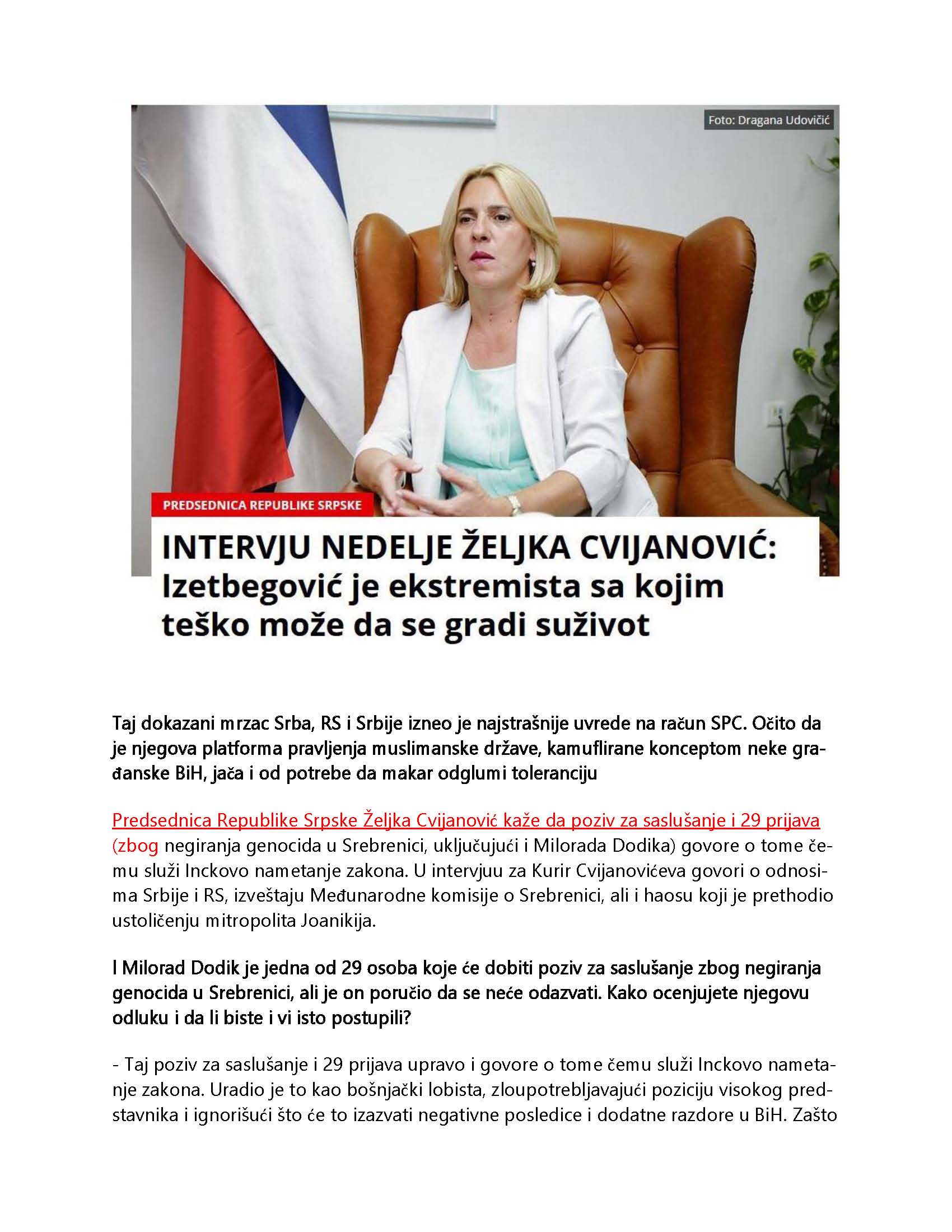 U intervjuu za „Kurir” predsjednica Republike Srpske Željka Cvijanović, između ostaloga, govori o odnosima Srbije i Republike Srpske i izvještaju Međunarodne komisije o Srebrenici.