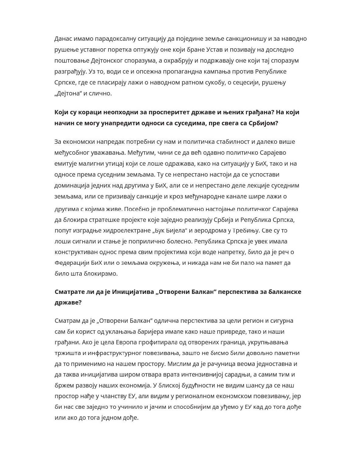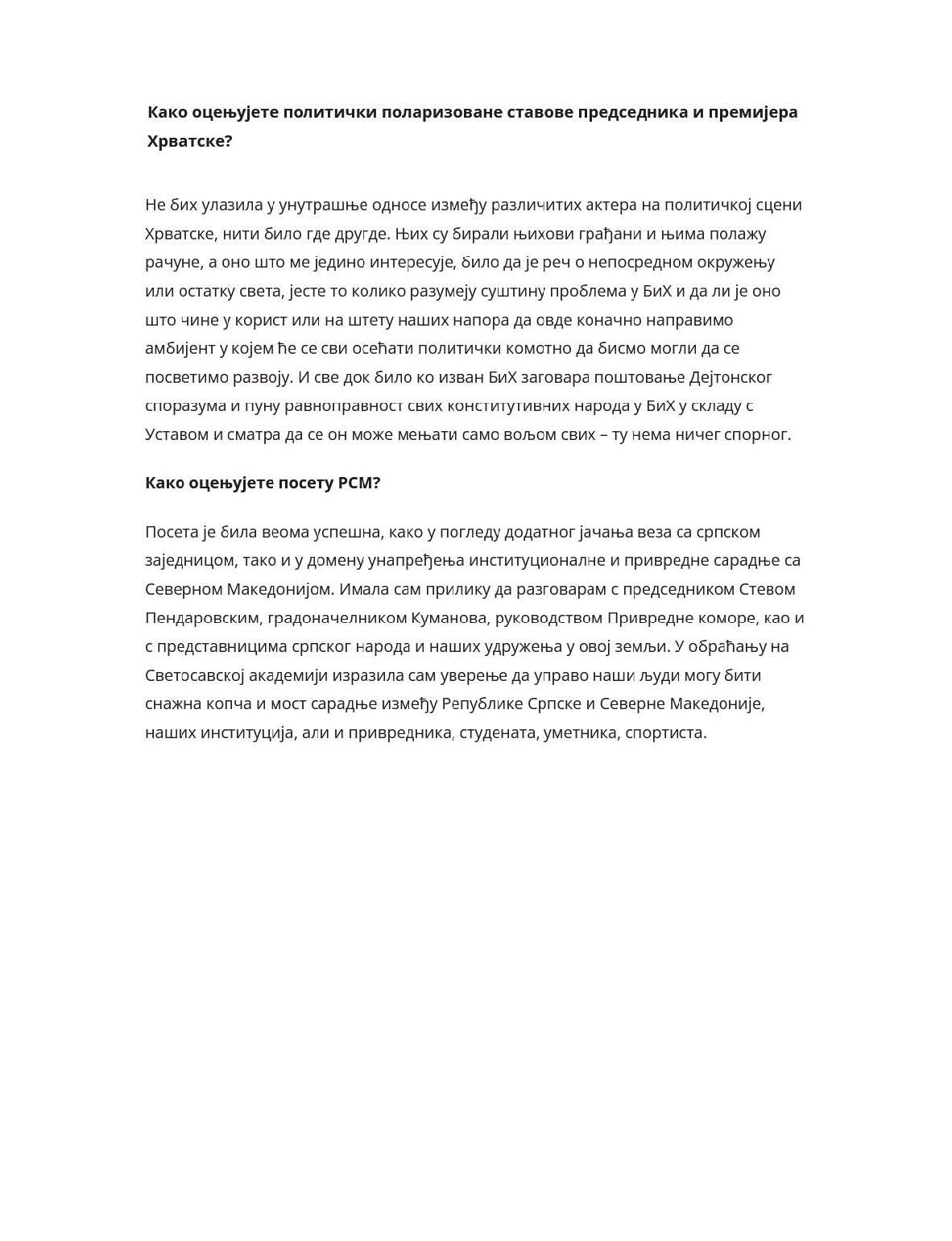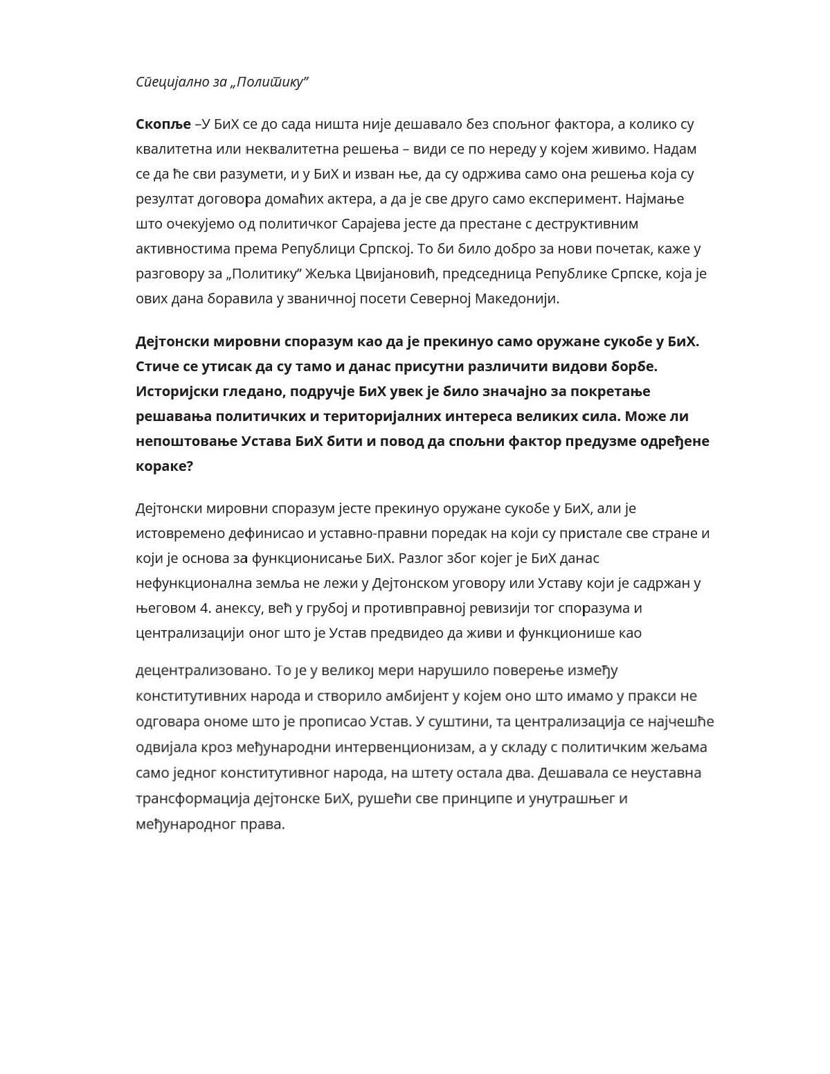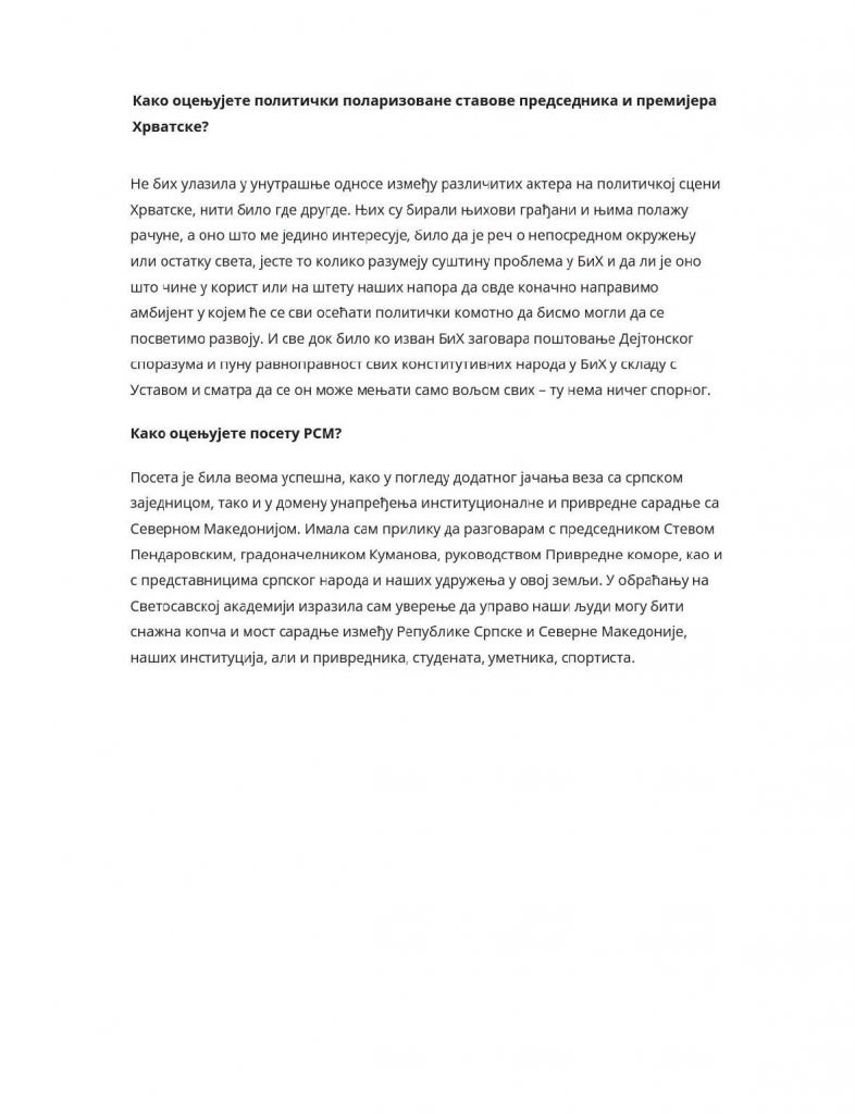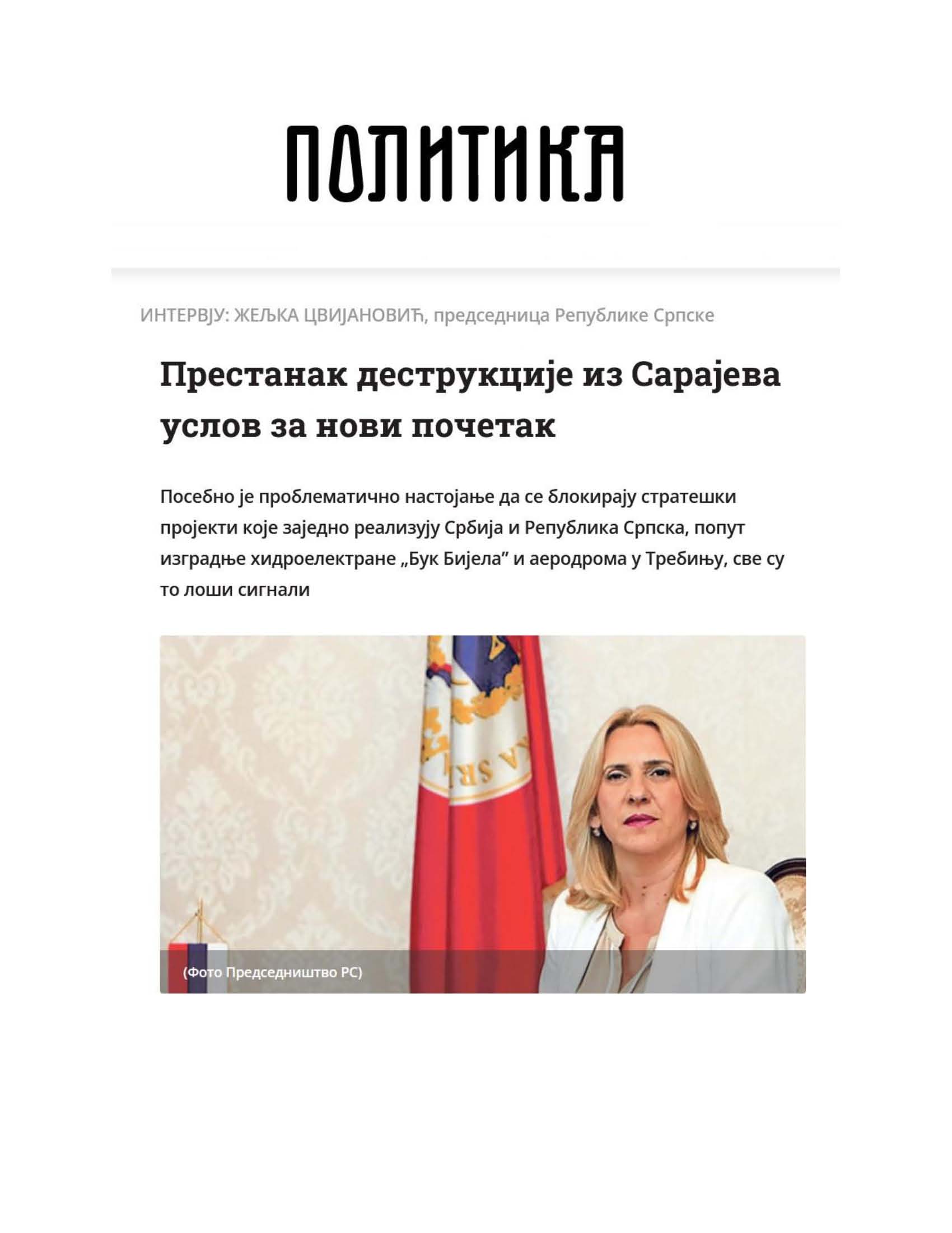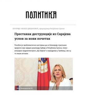 U BiH se do sada ništa nije dešavalo bez spoljnog faktora, a koliko su kvalitetna ili nekvalitetna rješenja – vidi se po neredu u kojem živimo. Nadam se da će svi razumjeti, i u BiH i izvan nje, da su održiva samo ona rješenja koja su rezultat dogovora domaćih aktera, a da je sve drugo samo eksperiment. Najmanje što očekujemo od političkog Sarajeva jeste da prestane s destruktivnim aktivnostima prema Republici Srpskoj. To bi bilo dobro za novi početak, kaže u razgovoru za „Politiku” Željka Cvijanović, predsjednica Republike Srpske.