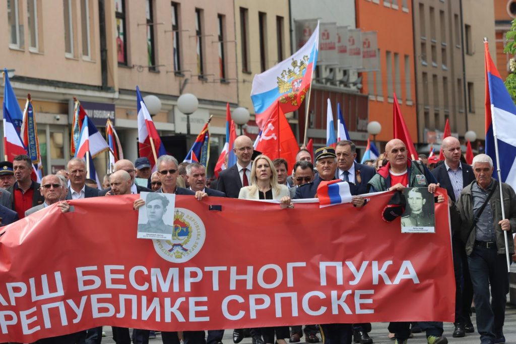 Prije obraćanja zvaničnika na obilježavanju Dana pobjede nad fašizmom u Drugom svjetskom ratu, održan je marš “Besmrtnog puka” u Banjaluci i položeni vijenci na spomen-obilježja.