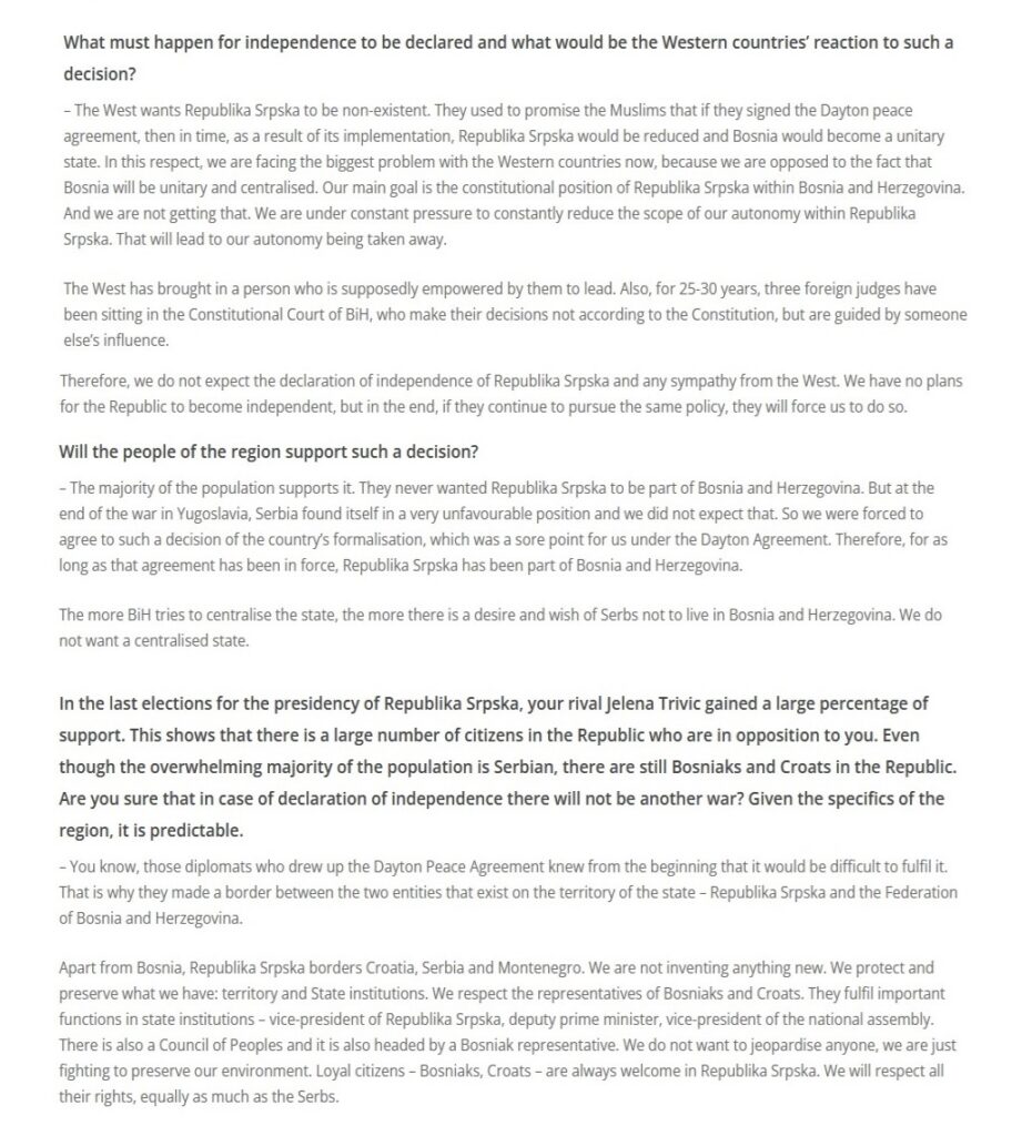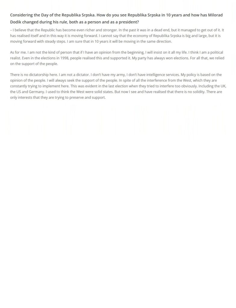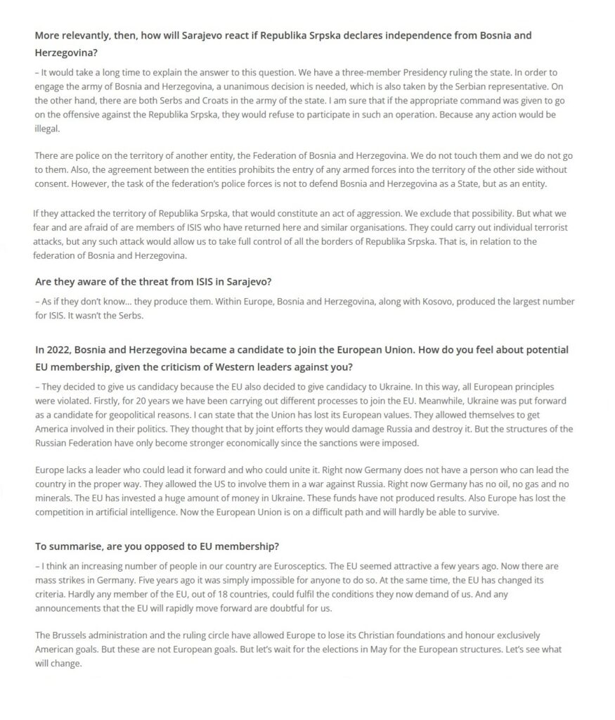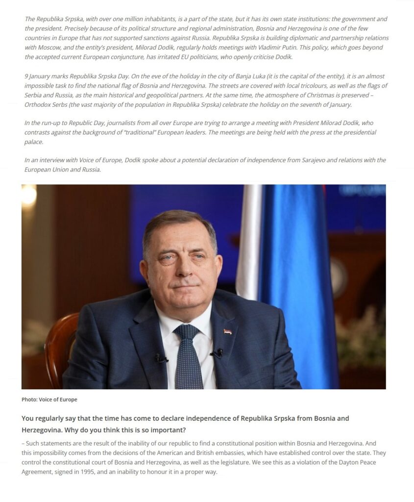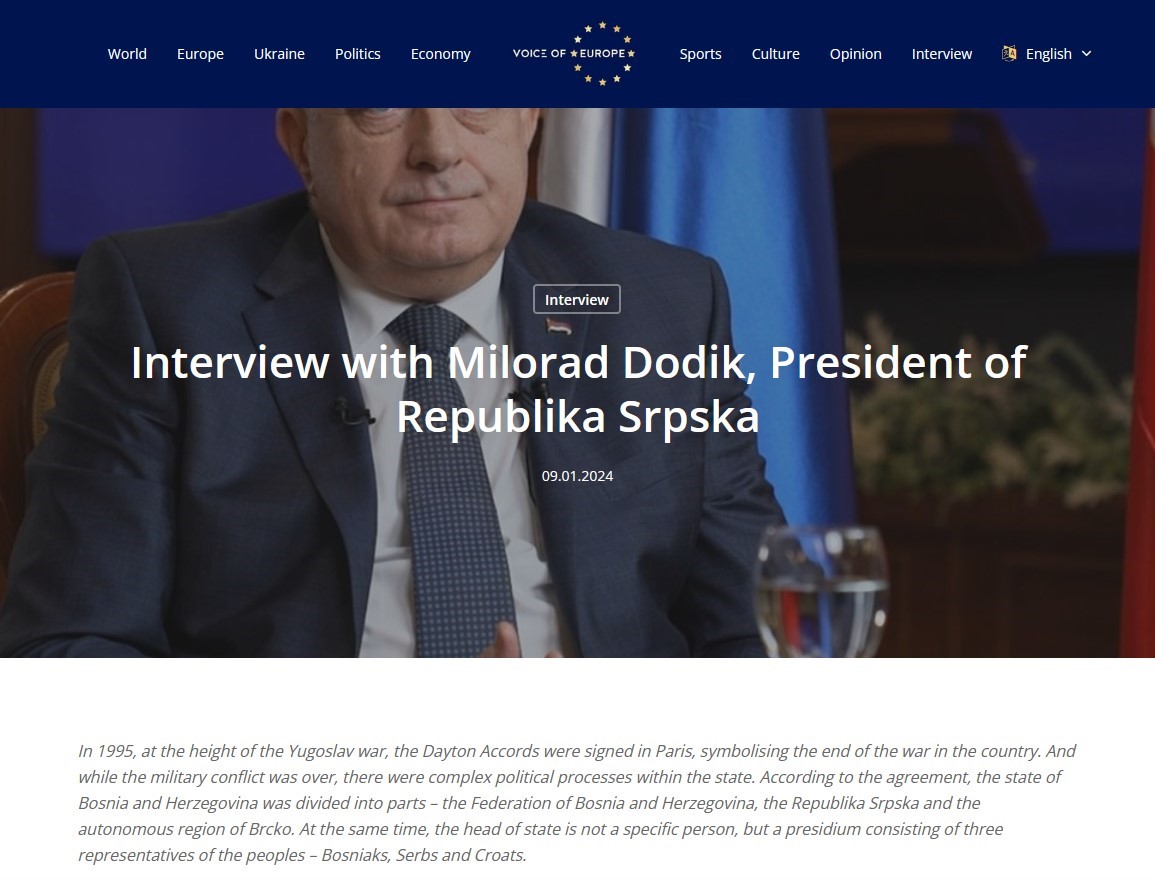 Intervju predsjednika Republike Srpske za “Voice of Europe“, 09.01.2024. godine