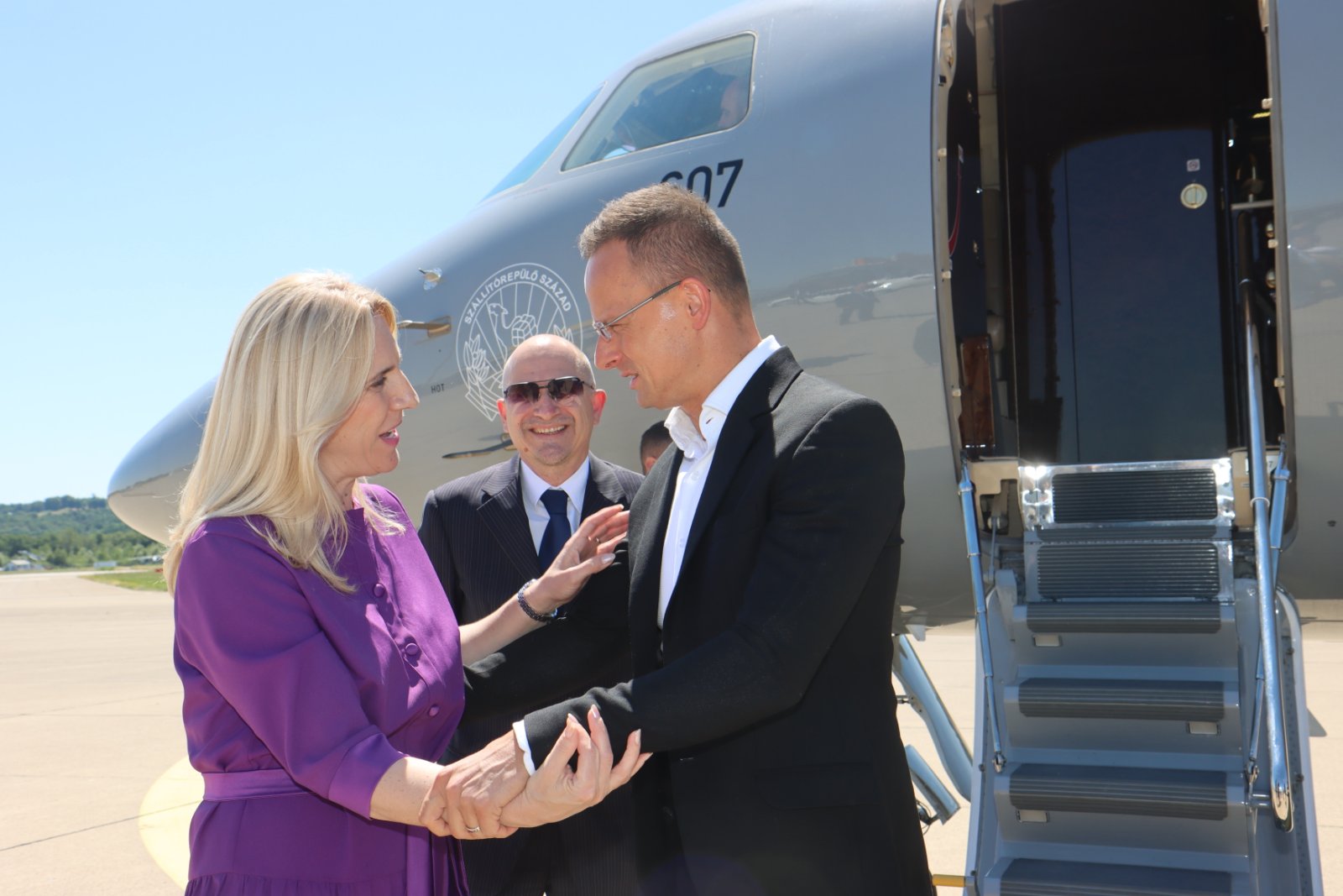 Предсједница Републике Српске Жељка Цвијановић дочекала је данас на Аеродрому Бањалука министра спољних послова и трговине Мађарске Петера Сијарта.