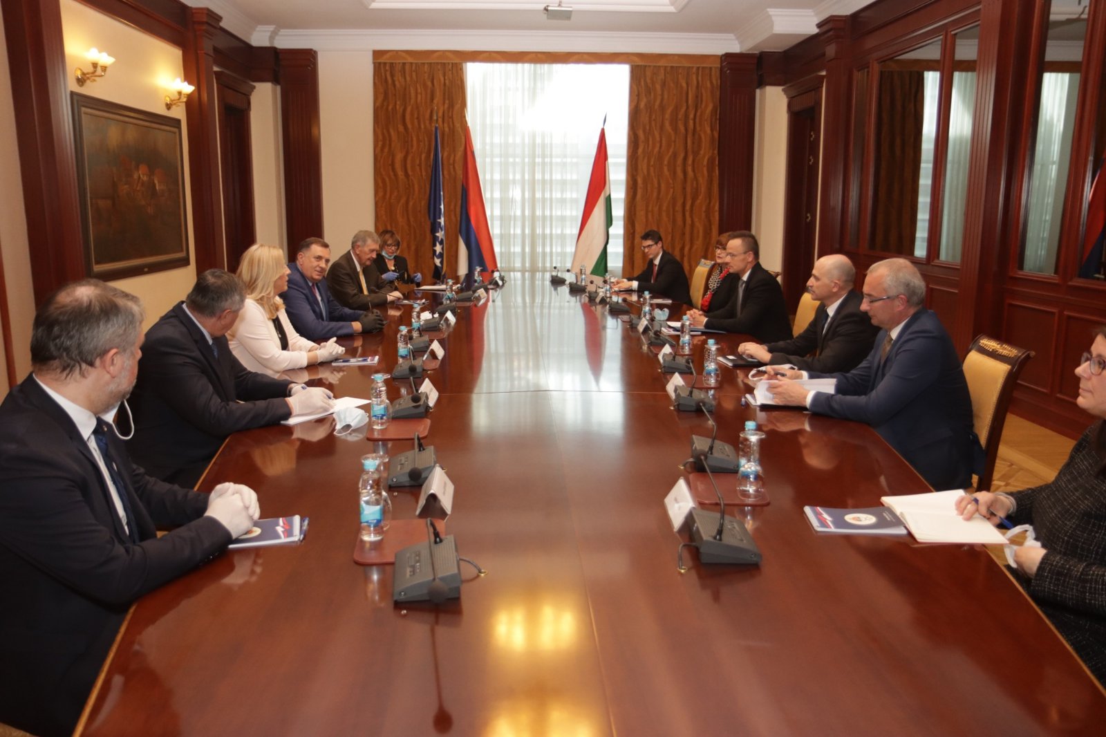 Предсједница Републике Српске Жељка Цвијановић, премијер Радован Вишковић и српски члан Предсједништва БиХ Милорад Додик разговарали су данас у Бањалуци са министром спољних послова и трговине Мађарске Петером Сијартом. Министар спољних послова и трговине Мађарске допутовао је у пратњи хуманитарне помоћи коју Мађарска шаље Републици Српској за борбу против епидемије изазване вирусом корона.