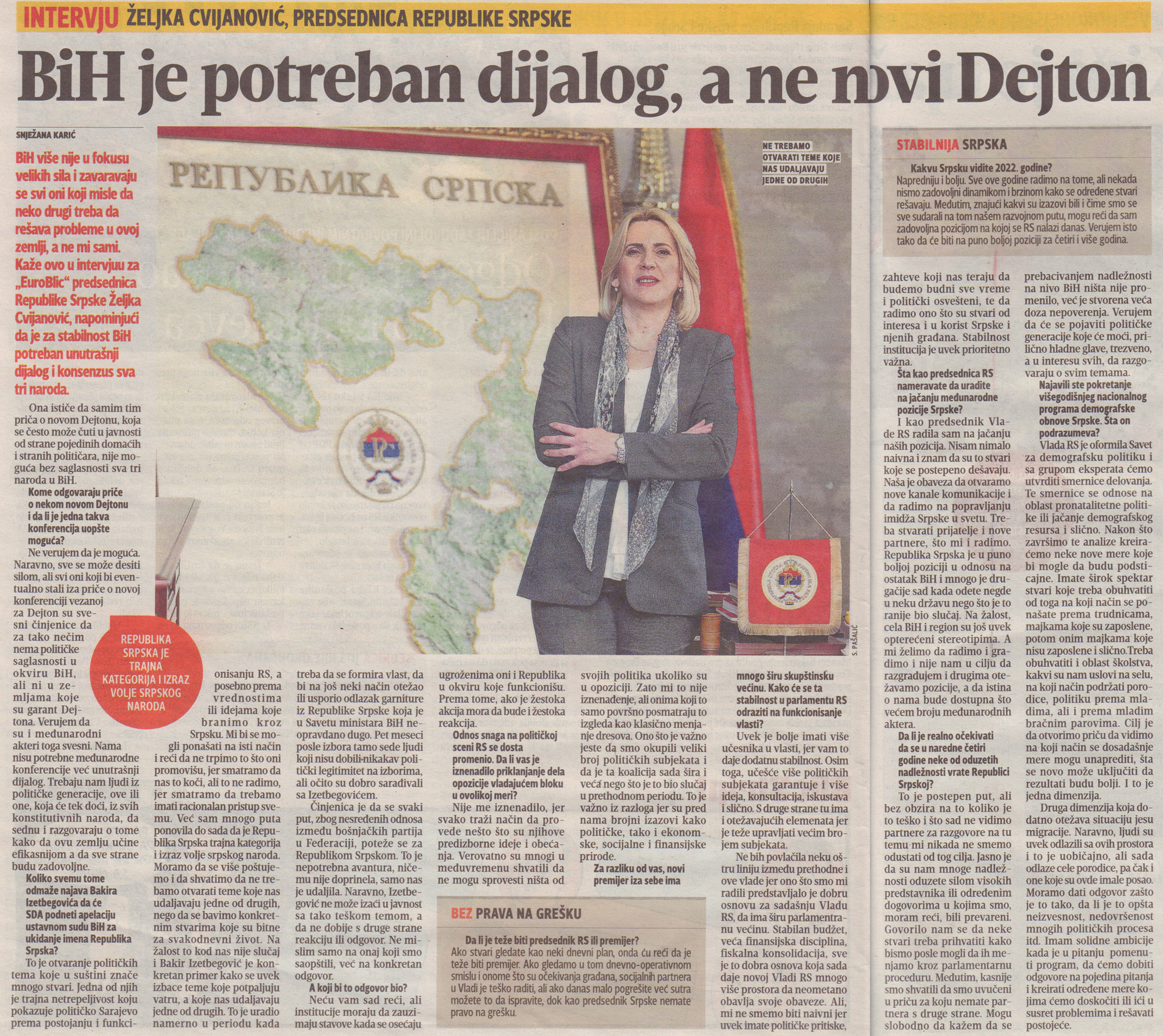 Предсједник Републике Српске Жељка Цвијановић изјавила је да БиХ није више у фокусу великих сила и да се заваравају сви који мисле да неко други треба да рјешава проблеме у овој земљи, наглашавајући да је за стабилност БиХ потребан унутрашњи дијалог и консензус сва три народа.
