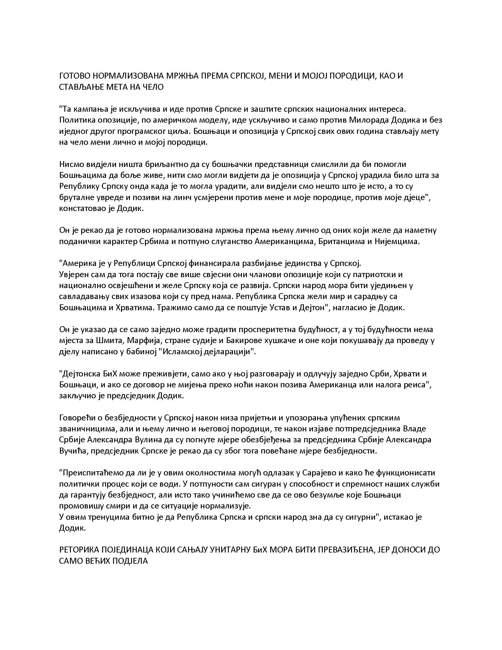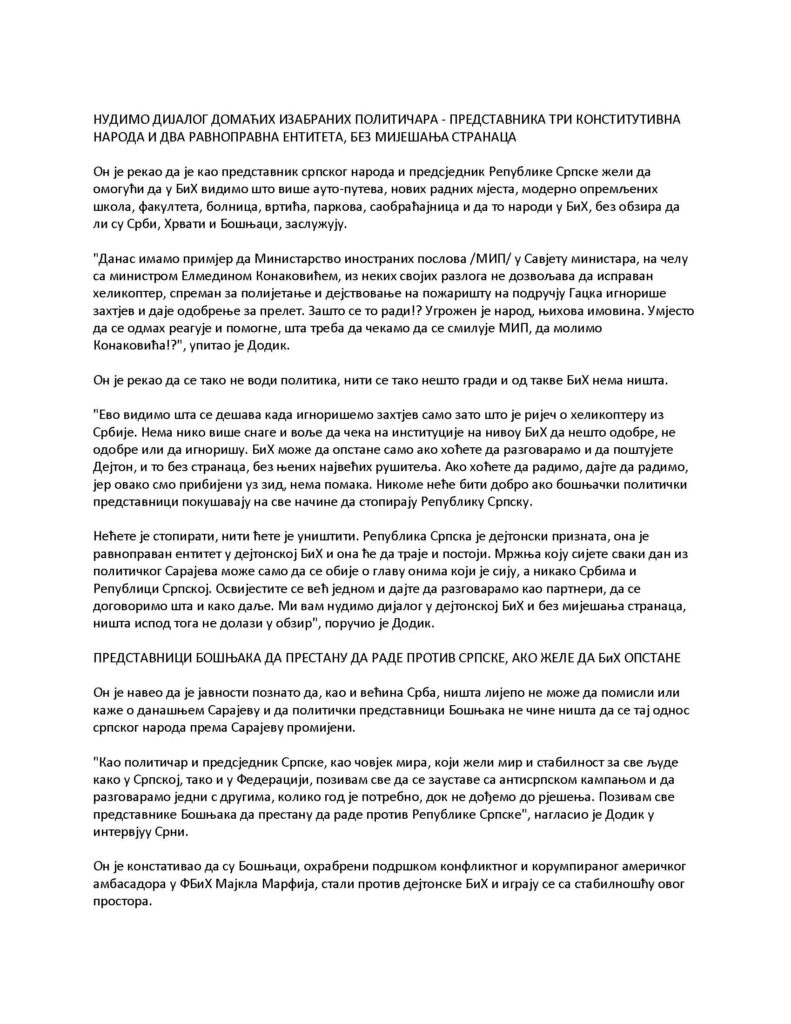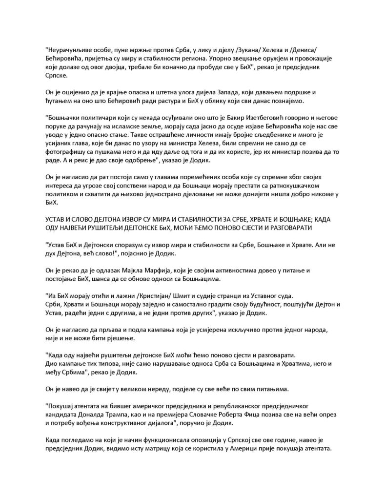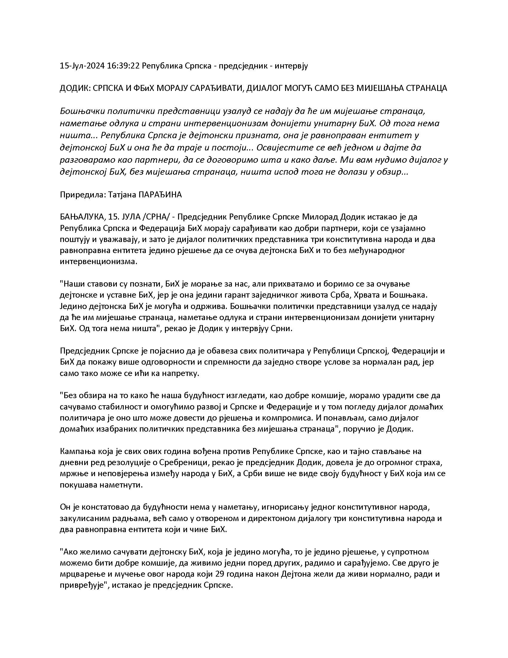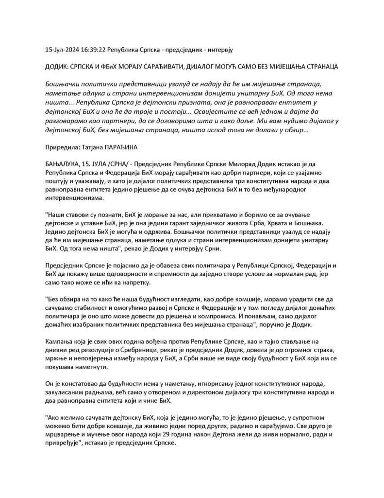 Интервју предсједника Републике Српске за Новинску агенцију Републике Српске 15.07.2024