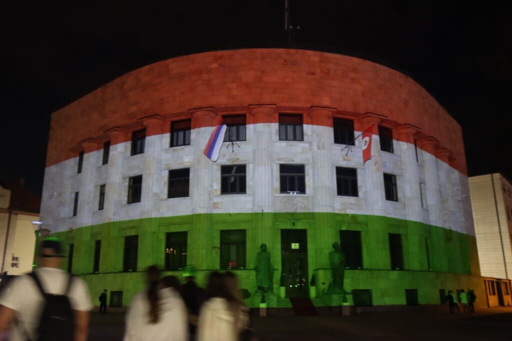 Палата Републике освијетљена је вечерас у бојама мађарске заставе у знак добродошлице предсједнику Владе Мађарске Виктору Орбану и делегацији те земље, који су допутовали у Републику Српску.