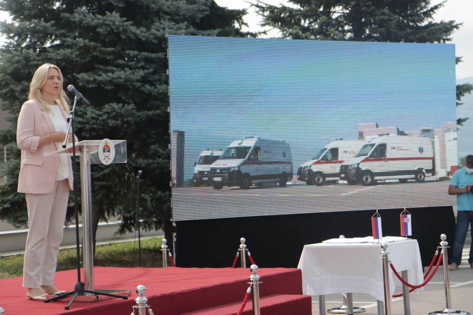Предсједница Републике Српске захвалила је Србији и предсједнику Србије Александру Вучићу за вриједну донацију од 15 санитетских возила које је Србија донирала здравственим установама у локалним заједницама у Српској, наводећи да ова посјета показује да су нераскидиве везе Српске и Србије.