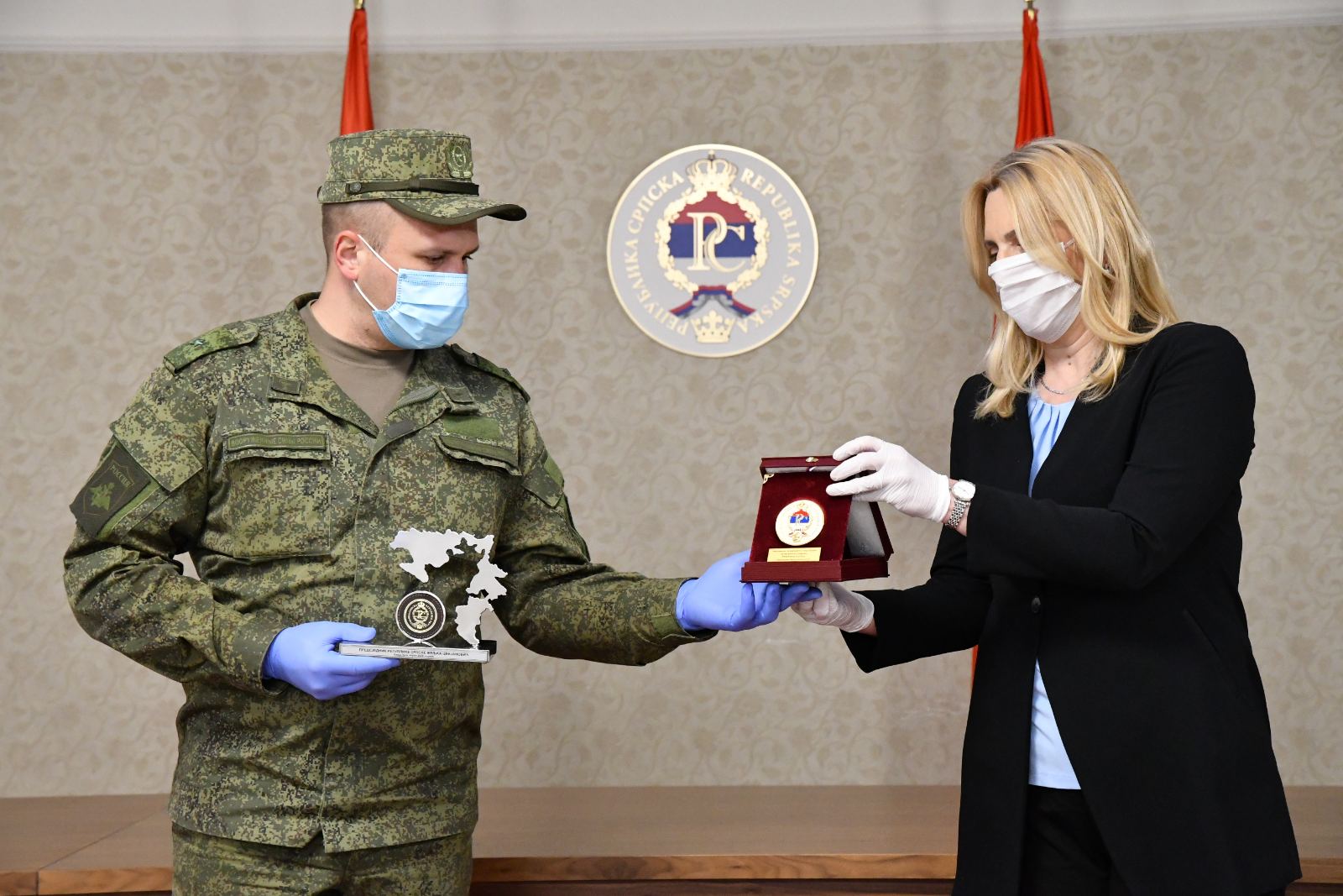 Предсједница Републике Српске Жељка Цвијановић уручила је данас у сједишту Републике Српске у Источном Сарајеву одликовање и захвалнице припадницима одреда оружаних снага Руске Федерације који је у Републику Српску дошао на позив највиших званичника Републике Српске, с циљем пружања помоћи у борби против пандемије КОВИД-19, изазване вирусом корона.