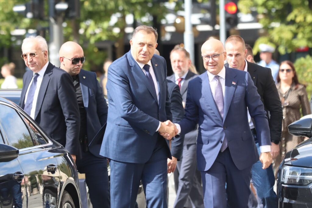 Предсједник Републике Српске Милорад Додик свечано је дочекао предсједника Владе Србије Милоша Вучевића испред Палате Републике у Бањалуци.