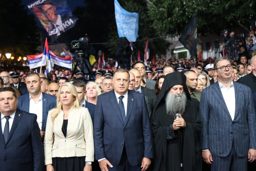 Предсједник Републике Српске је нагласио да српски народ ако хоће да има стабилност и свијетлу будућност мора стати иза Вучића, те додао да ово није политички митинг него порука која мора бити свима јасна.
