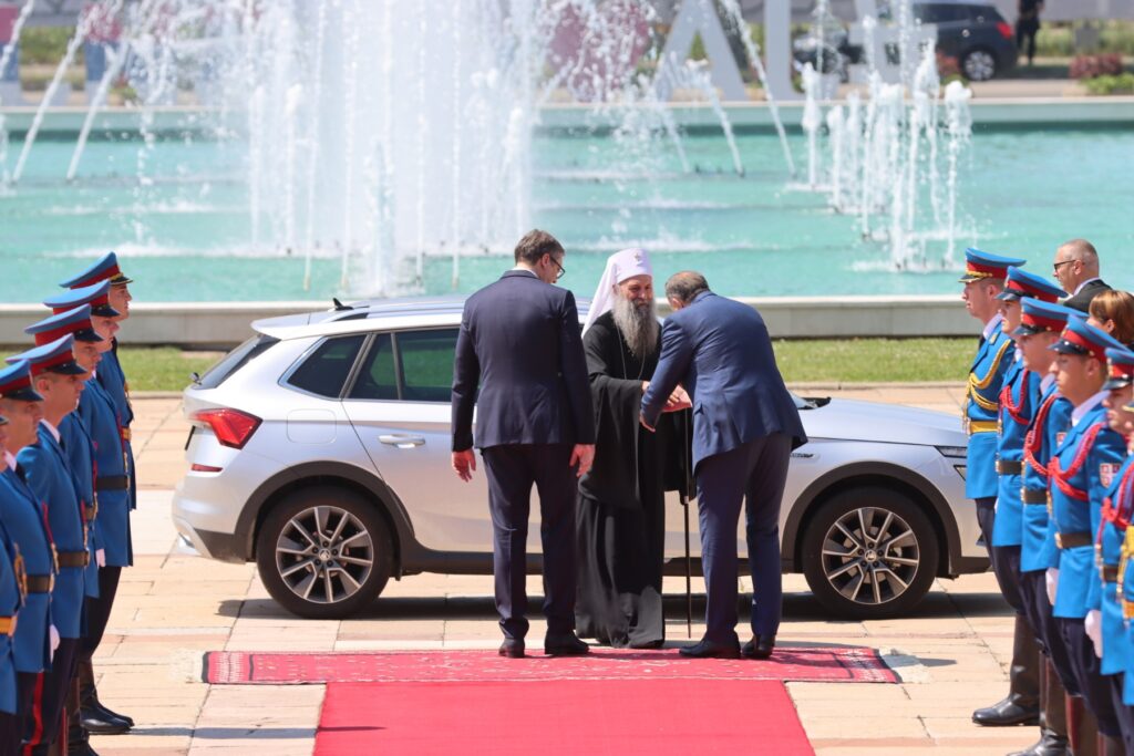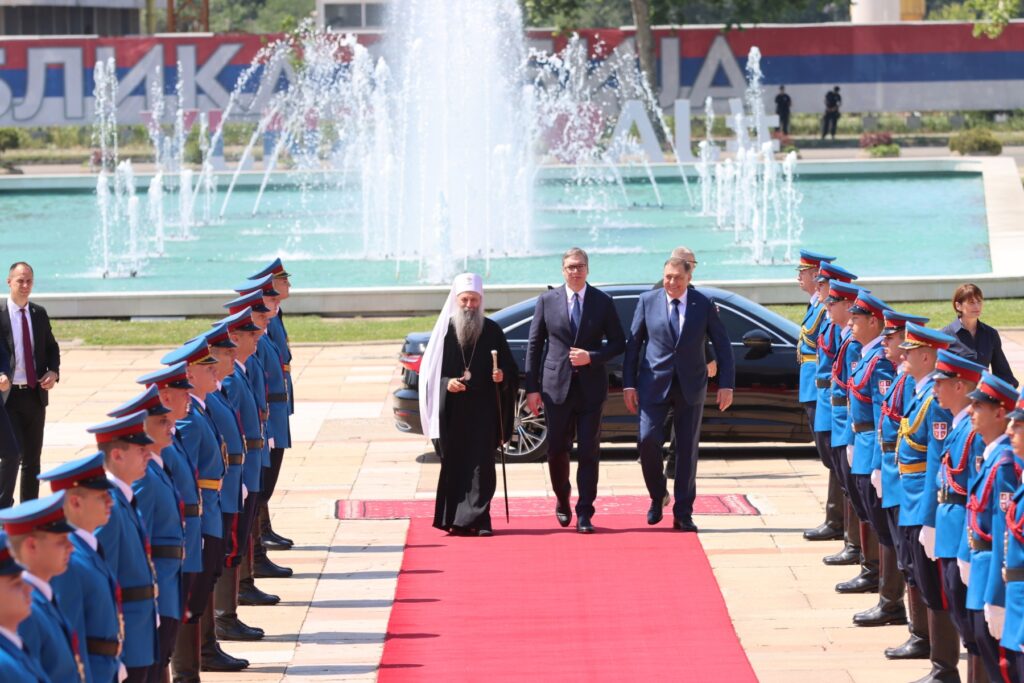 Свечани дочек највиших званичника уз постројене припаднике Гарде приређен је испред Палате Србије. Предсједника Додика дочекао је предсједник Србије Александар Вучић, а потом су оба предсједника дочекала и српског патријарха Порфирија. Дочек су пратила црквена звона.