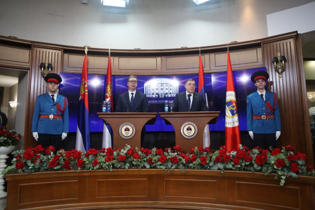 Предсједник Додик је изјавио, на конференцији за медије која је одржана након састанака, да је Република Српска поносна да први пут прославља Дан државности, који је и Дан државности Србије и веома је захвална предсједнику Србије Александру Вучићу који је у дводневној посјети.